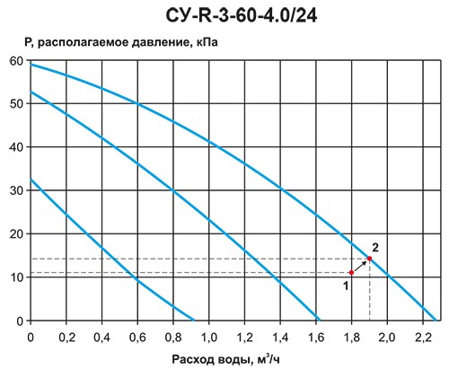 Допустим, после расчетов требуемый расход воды для трехрядного нагревателя TFT 600.350.3 равен 1,8 м3/ч, при этом расходе потери давления по воде для данного нагревателя составляют 11 кПа (точка 1 на графике СУ-R-3-60-4.0/24). Оптимально для рассматриваемого примера подойдет смесительный узел СУ-R-3-60-4.0/24, при этом, так как точка потерь в нагревателе (точка 1, см график) располагается выше графиков первой и второй скорости работы насоса смесительного узла, то реальная рабочая точка системы нагреватель-смесительный узел (без учета гидравлических потерь в соединительных элементах между смесительным узлом и нагревателем) примет положение (точка 2) и будет равна расходу ≈ 1,9 м3/ч, давлению ≈ 13кПа.